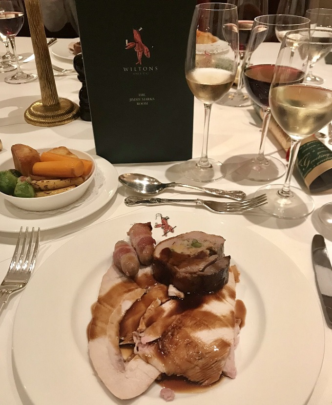 After enjoying champagne and canapes upon arrival my party sat down to a dinner in the private Jimmy Marks dining room. To start the festive meal, we enjoyed a dish of Venison Carpaccio with a Quince and Hazelnut Salad. The star of the meal was the beautifully roasted Norfolk Turkey which was presented on Wiltons’ traditional carving trolley to audible gasps in the room. It’s a showstopper when its wheeled out and revealed from under its silver domed cocoon. The bird was expertly carved in front of us and was served with all the trimmings including roast potatoes, honey truffles parsnips and Brussels sprouts. It was delicious and got us feeling very Christmassy. For dessert a Sauternes custard with Armagnac prunes finished the meal off nicely and beautifully matched wines were served throughout to complement our Christmas meal. Of course, it goes without saying the service was outstanding- Wiltons’ have been serving fine food since 1742 and is known for traditional and courteous hospitality and service. For further information about Wiltons’ Christmas Dining options visit www.wiltons.co.uk