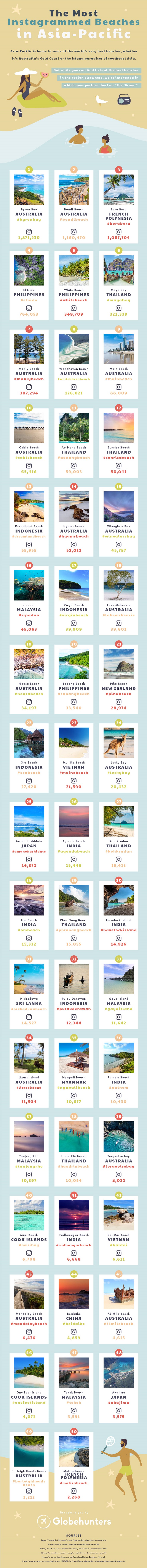 Asia-Pacific is home to some of the world’s very best beaches, whether it is Australia’s Gold Coast or the island paradises of south- east Asia. But while you can find lists of the best beaches in the region elsewhere, our friends over at Globehunters have compiled an infographic of the ones that really are picture-perfect – the ones that perform best on the ‘Gram!  It seems #Byron Bay is the most popular beach hashtag in Australia (beating #Bondi) while  the glorious #Borabora in Tahiti is the most popular in the rest of the Asia pacific. And once you have picked your personal favourite Globehunters have the best airfare deals to fly you there.