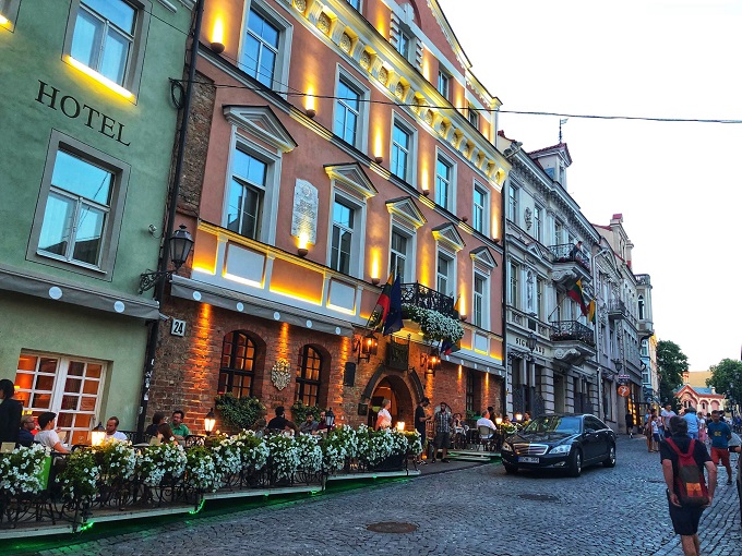 For those who want to venture beyond Vilnius the hotel can organise a visit to the nearby Trakai Castle in style in a chauffeur-driven Mercedes Benz S-Class/ It’s a day trip worth taking, as the red brick castle sits in the middle of a tranquil lake dotted with sailboats and cruisers. After a day exploring Trakai we unwind in the basement spa with its vaulted arches and cascading water features. There is a steam room, Jacuzzi and small but perfectly formed swimming pool, ideal for a relaxed swim after a busy day. Massages and facials are also on offer. There is a lot going on in the basement of this hotel: the breakfast is served in the old cellars with low brick archways and a curved ceiling. Just make sure to duck as you head for the buffet table, the arches were made for shorter generations! In the evening the space transforms into a quirky cellar restaurant lit by candlelight. On our last evening we eat at the summer terrace outside the hotel. It is a popular spot. The terrace is packed with locals as well as tourists, dining on Lithuanian tasting menus. In winter the indoor a la carte restaurant is equally popular, serving up hearty soups and traditional cepelinai dumplings. However, on this warm evening we sit on the terrace with a glass of Lithuanian red and people-watch until the sun sets.