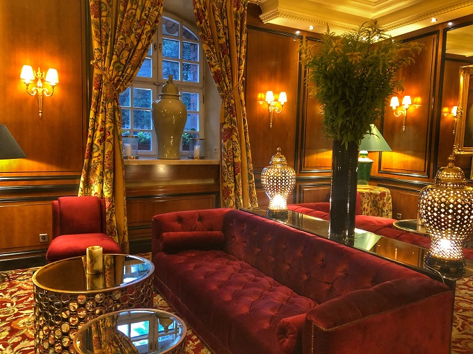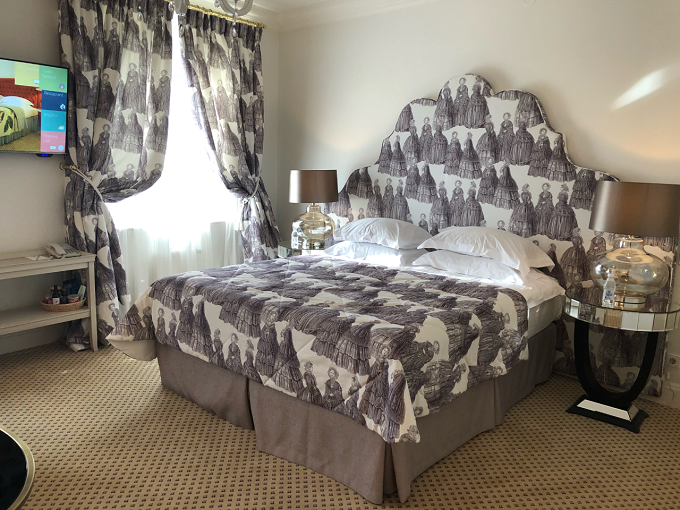 Part of the hotel’s charm is that none of the 53 rooms and suites in this classically styled hotel are the same. Each has individual touches that makes them unique. Our room was a sophisticated mix of soft grey and white tones with brass coffee tables and a chic monochrome pattern of crinolined ladies dancing over the fabric of the headboard and drapes. Other rooms have cherry red touches or wooden beams and wall paintings.