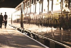 hostess urges. The skirl of pipes signals the piper's approach. We fall in behind, as he escorts the party of guests to the waiting train. There is no mistaking the deep-red carriages with the gold crest Great Scottish and Western Railway Company emblazoned on the side. Waiting to welcome us aboard, are the train manager and his staff - all wearing The Royal Scotsman's