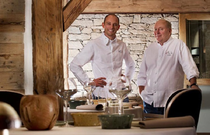 FATHER AND SON, Chef Rene and Chef Maxime Meilleur have had an amazing trajectory.  From a farming family background  they have risen to becoming world renown Chefs. Their restaurant La Bouitte is literally the highest 3* Michelin restaurant in Europe; situated in the tiny Alpine village of  Saint-Martin de Belleville, at the gates of the largest skiing area of the world, the  Three Valleys. At the beginning, René and Marie-Louise served fondues and local cuisine, then inspired by Paul Bocuse the turned to haute cuisine. In 1996, their son Maxime  a former biathlete in the junior French team,  joined them and a Michelin-starred restaurant was born.